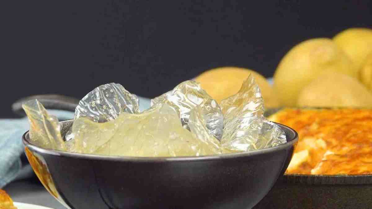 - Mélangez maintenant l'eau des pommes de terre avec la fécule et faites bouillir le tout en remuant jusqu'à ce que le tout devienne transparent et gélatineux. Conseil : attendez que l'eau des pomme de terre ait refroidi et versez-la à travers un torchon propre avant de la mélanger avec la fécule et de la faire bouillir. Ainsi, vous n'aurez pas de morceaux de pommes de terre dans vos chips transparentes plus tard.