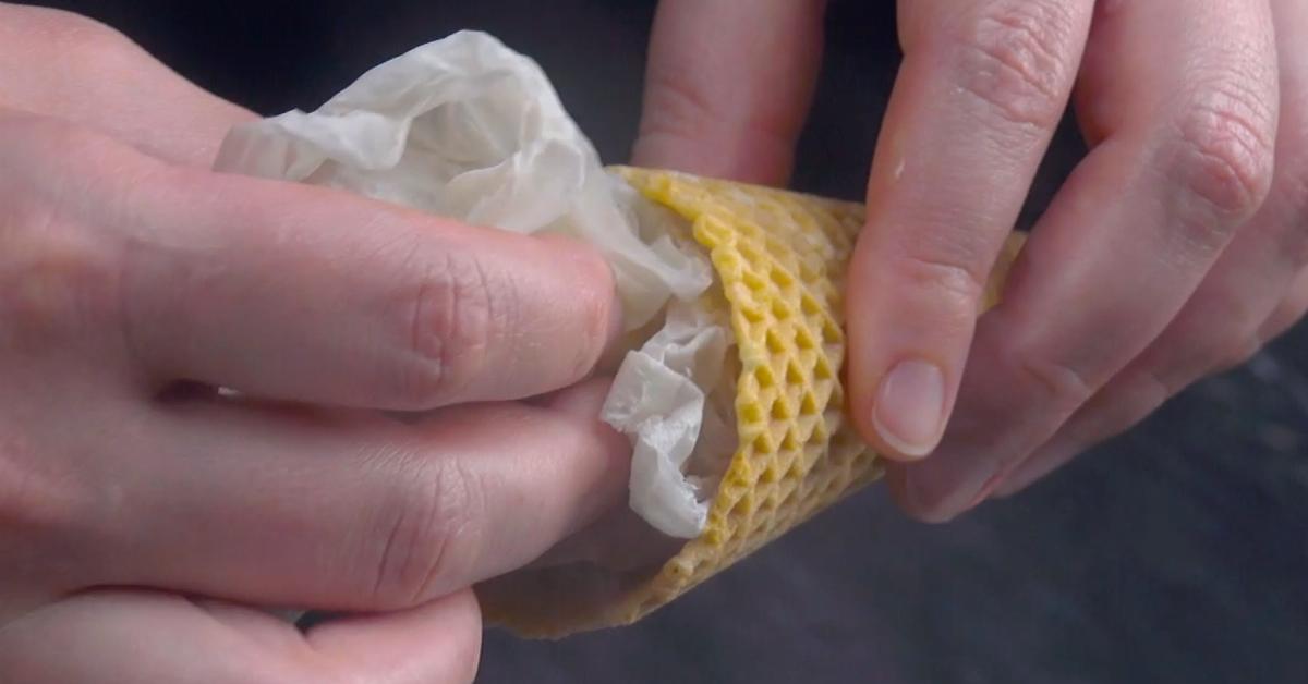 Ce choco-tacos rempli de glace à la fraise est fait avec une gaufrette