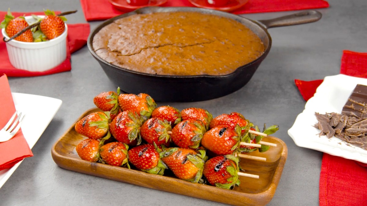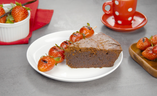 Gâteau au chocolat et brochettes de fraises au barbecue