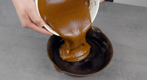 - Faites fondre le beurre et le chocolat au bain-marie et mélangez bien le tout. Tamisez ensuite la farine, la levure et le sel et mélangez-les avec l'huile, l'arôme vanille, le sucre de canne et les œufs jusqu'à obtenir un mélange homogène. Versez la pâte dans une poêle en fonte légèrement graissée.