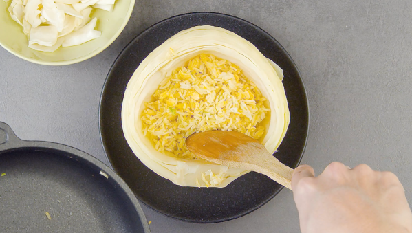 - Mettez l'ail et le gingembre dans une poêle avec de l'huile. Ajoutez les œufs battus, le riz cuit et les oignons nouveaux. Mettez l'œuf et le riz dans le chou blanc.