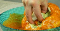 • Trempez à présent le chou-fleur dans votre mélange pour qu’il en soit totalement recouvert. Vous pouvez également utiliser un pinceau si vous préférez.