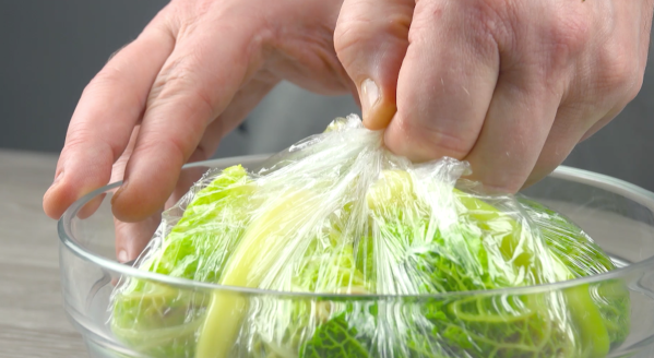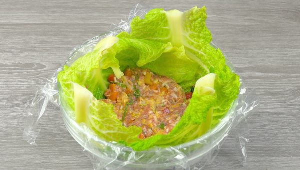 - Alternez les couches de feuilles de chou et de viande hachée dans le bol. La dernière couche doit être du chou. Fermez bien le tout en forme de boule à l'aide du film alimentaire et placez le chou au réfrigérateur pendant au moins 2 heures.