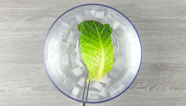 - Retirez la tige et les feuilles extérieures du chou frisé.Blanchissez les feuilles extérieures pendant environ 2 à 3 minutes dans de l'eau salée, puis trempez-les dans de l'eau glacée.Tamponnez les feuilles avec un chiffon. Recouvrez un saladier de film alimentaire et mettez-y une couche de feuilles de chou frisé. (Le bol doit avoir un diamètre d'environ 19 cm).