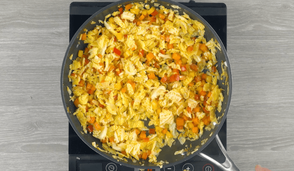 - Coupez le reste du chou frisé, la carotte, le poivron, l'oignon et l'ail en petits morceaux et faites-les revenir à la poêle avec un peu d'huile. Assaisonnez avec des graines de fenouil, du sel et du poivre. Versez les légumes dans un saladier et laissez refroidir un peu.