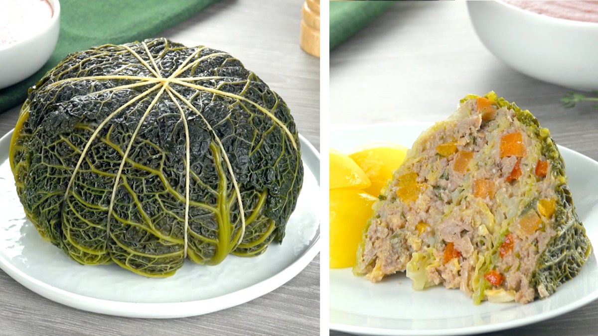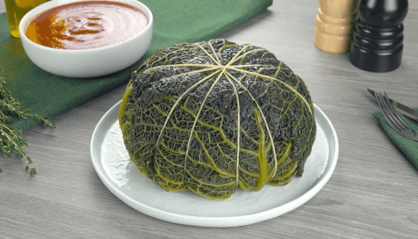 Le chou frisé est un légume complètement sous-estimé, que certaines personnes mangent rarement, voire jamais. Sauf que les possibilités culinaires avec cet ingrédient sont variées ! Dans la recette suivante, nous remplissons le chou frisé de viande hachée, de légumes et d’herbes et nous l’enveloppons de ficelle de cuisine pour qu’il ressemble à une citrouille avant de le servir. Un délice !