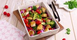 - Coupez le brocoli, l'oignon, le poivron et la courgette. Mettez-les dans un saladier avec les tomates cerises. Ajoutez la sauce.