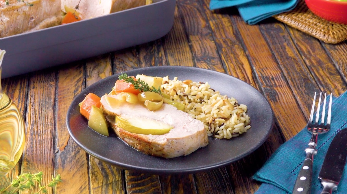 Qu’est-ce que vous diriez d’une pièce de porc parfumée à la pomme, accompagnée de légumes rôtis et d’un riz savoureux ? Plutôt tentant, non ?