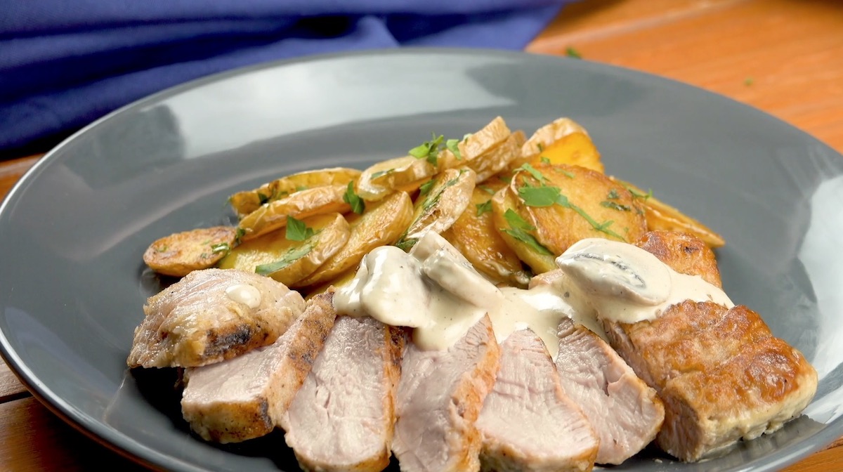 Un plat avec du filet de porc est déjà succulent à la base, mais là, accompagné de sauce à la moutarde, pommes de terre frites croustillantes et de champignons frais, c’est juste la folie !