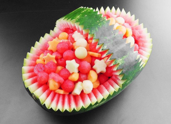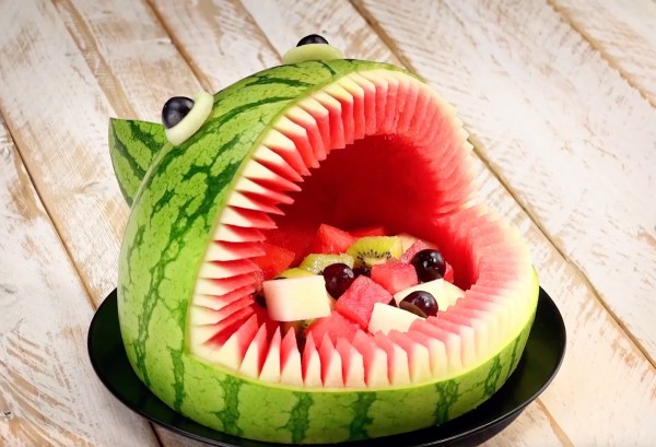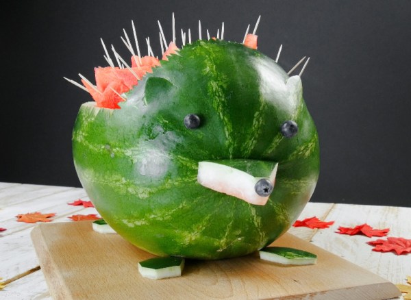 - 1. Prenez une grosse pastèque et découpez-la en forme de hérisson.
