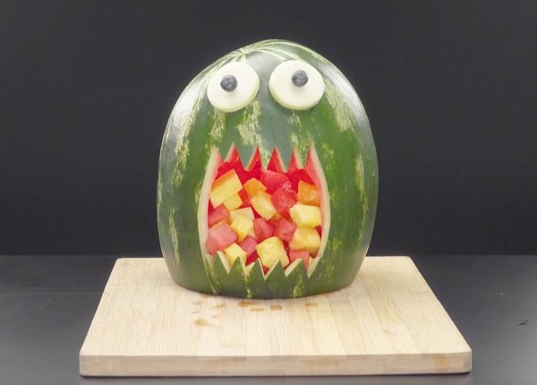 2. Utilisez un melon jaune pour les dents et des raisins noirs pour les yeux, fixez-les avec des cure-dents. - 1. Prenez une pastèque et découpez-la en forme de panier.