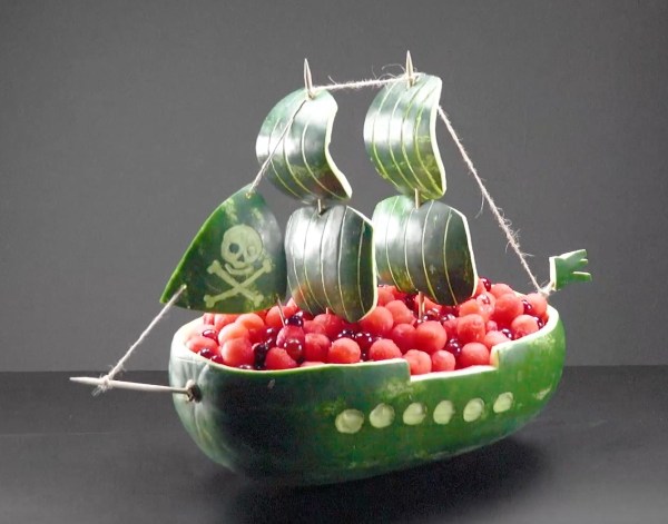 2. Utilisez des myrtilles pour les yeux et fixez-les avec des cure-dents. - 1. Prenez une grosse pastèque et découpez-la en forme de bateau.