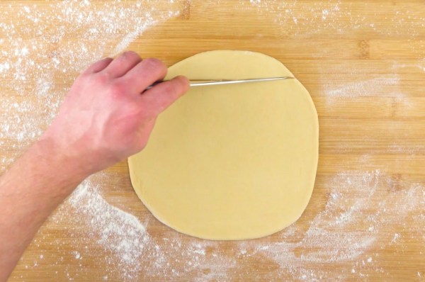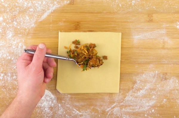 - Mettez la farine de blé dans un saladier puis faites un puits au milieu. Ajoutez ensuite le reste des ingrédients et pétrissez bien le tout pour former une pâte homogène et lisse.Dispersez la farine sur le plan de travail, découpez un morceau de pâte que vous étalez puis coupez-en les extrémités pour former un carré.