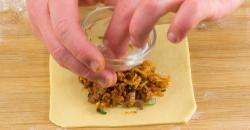 - Mélangez la viande hachée et l'ensemble des ingrédients secs dans un petit saladier. Déposez une grosse cuillère à soupe de ce mélange au milieu des carrés de pâte.Humidifiez les bords vierges du pastéis avec l'eau puis refermez le tout de façon à former un chausson. Scellez les bords en pressant dessus les dents d'une fourchette.Mettez le pastéis pendant 6 minutes dans de l'huile à 180 °C.