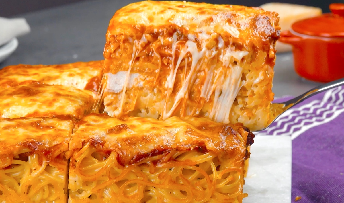 Nous vous avons déjà montré plusieurs fois qu’un gâteau n’est pas forcément toujours sucré. Cette recette ressemble à un gâteau, mais aussi à un gratin. Un mélange de spaghettis, d’escalopes, de sauce tomate et de beaucoup de fromage. Le tout préparé dans un moule à gâteau. Cela peut sembler bizarre, mais c’est délicieux !