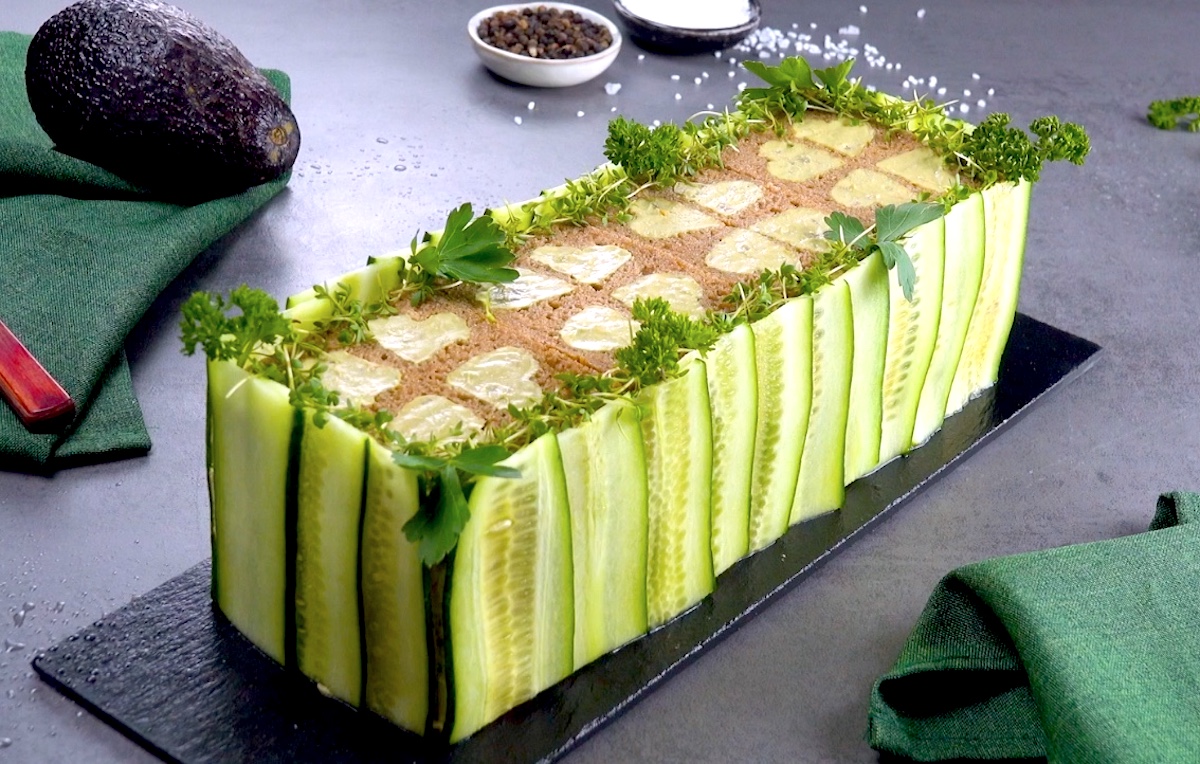 4. Gâteau d’été avec pain, guacamole, fromage frais, blanc de poulet et concombre