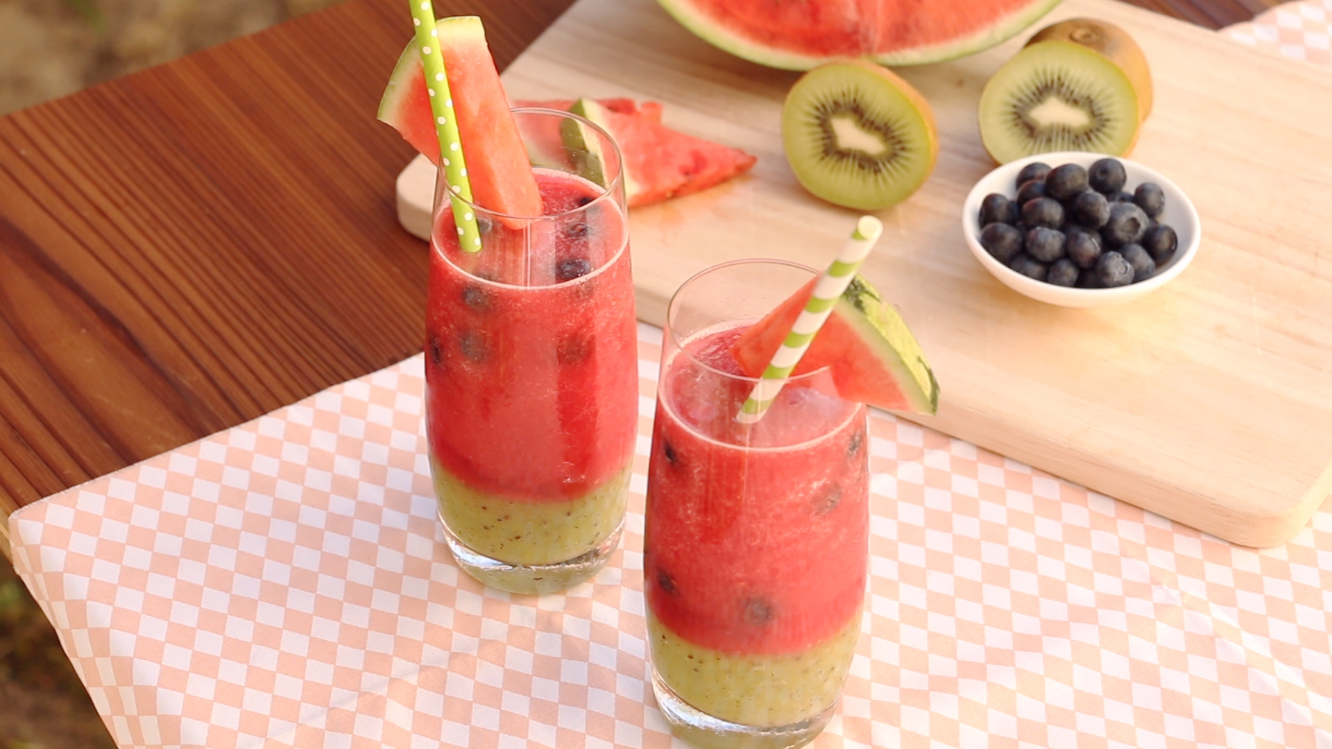 La météo des prochains jours n’est pas au top… Mais nous aurons encore peut-être la chance de profiter des douceurs de l’été indien et de se prélasser dehors en fin de journée ou pendant le week-end. Et pour profiter au maximum de ces derniers instants, quoi de mieux qu’un cocktail frais et fruité avec, si vous le souhaitez, une petite touche d’alcool ? Ce cocktail à base de kiwis et pastèque a quelque chose d’exotique. Avec une présentation comme celle-ci, on aurait presque l’impression d’être de retour sur un transat, les pieds dans le sable. C’est ici !