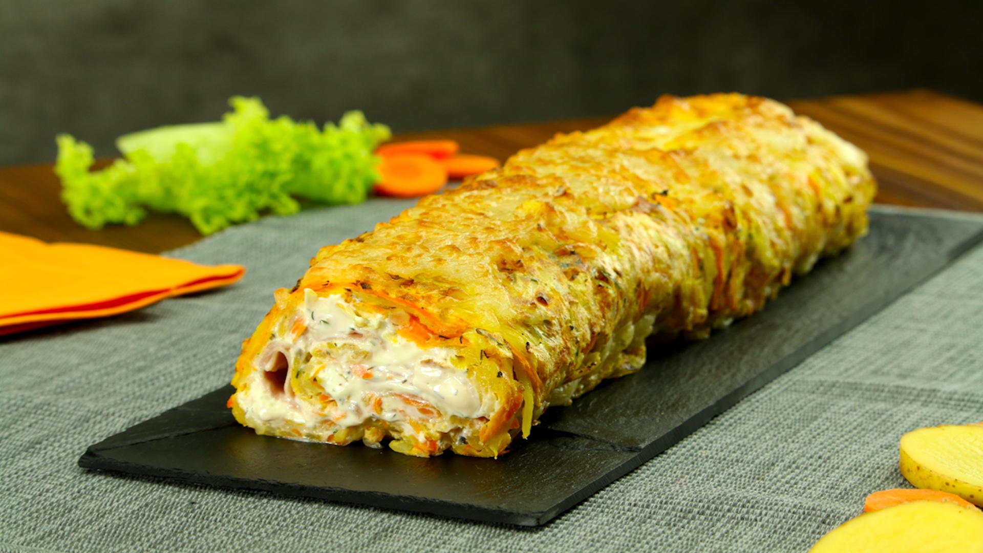 Les pommes de terre vont avec tout ou tout va avec des pommes de terre, enfin, vous avez compris l’idée. Voici une recette de pommes de terre au four d’un tout autre genre qui prendra la forme d’un rouleau et dont la garniture mettra l’eau à la bouche de tous vos invités.