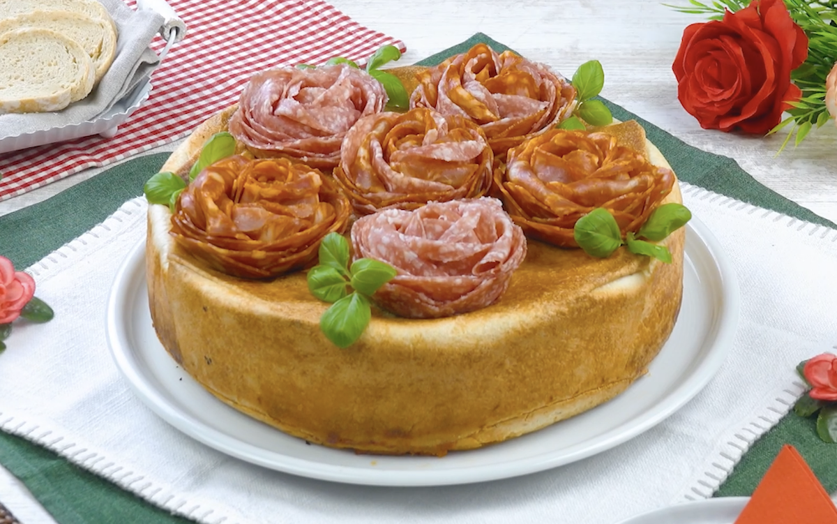 Laissez-vous séduire par notre gâteau de tortillas avec de jolies roses de salami, garni de différentes couches de salami, de fromage, de fromage frais, de sauce tomate et de basilic. C’est super bon et très simple à faire.
