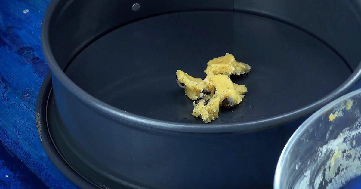- Émiettez la moitié de la pâte dans un plat à charnière puis pressez bien le tout dans le fond et sur les bords.
