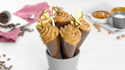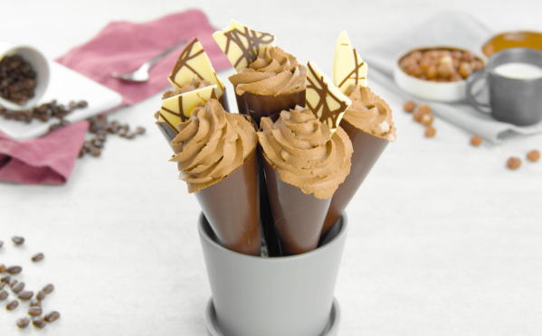 Ces jolis cornets de mousse au chocolat saupoudrés de morceaux de chocolat sont vraiment la touche finale parfaite pour une soirée gourmande réussie en famille ou entre amis. Et qui aurait cru qu’il était si facile de préparer soi-même de telles créations ? Pour ceux qui préfèrent un peu de couleur, il suffit d’utiliser du chocolat rose Ruby au lieu du chocolat blanc, par exemple. Essayez ! Bon Ap’ !
