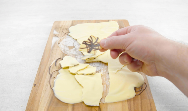 • Posez la cinquième feuille sur une planche. Répartissez le chocolat noir fondu en cercles sur la feuille. Laissez durcir pendant environ 5 minutes. Répartissez ensuite le chocolat blanc uniformément sur la feuille. Laissez durcir, puis cassez le chocolat en gros morceaux pour en faire des copeaux.