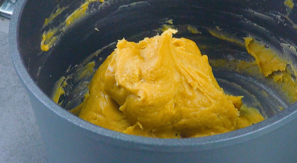 - Mettez le beurre, le sucre et l'eau dans une casserole et portez le tout à ébullition. Ajoutez la farine et mélangez le tout avec une cuillère en bois jusqu'à ce que la pâte soit lisse et se détache d'elle-même des parois de la casserole. Lorsque la pâte a légèrement refroidi, ajoutez l'arôme vanille et un œuf après l'autre à la masse.