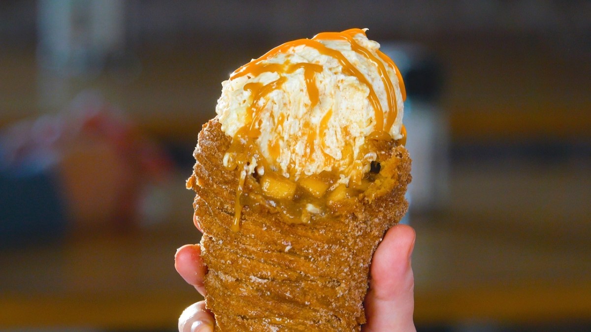 Tous ceux qui ont déjà dégusté des churros frais savent que c’est un moment particulier. Encore bien chaud, tout juste roulé dans de la cannelle et du sucre et agrémenté d’une délicieuse sauce : tout simplement divin ! Il est néanmoins temps d’innover en matière de churros. Aujourd’hui, nous vous proposons un cornet de churros garni de compote de pommes et de glace à la pomme faite maison. Cette recette est aussi simple que celle d’une tarte aux pommes traditionnelle, mais le résultat est bien plus intéressant et délicieux. On vous montre :
