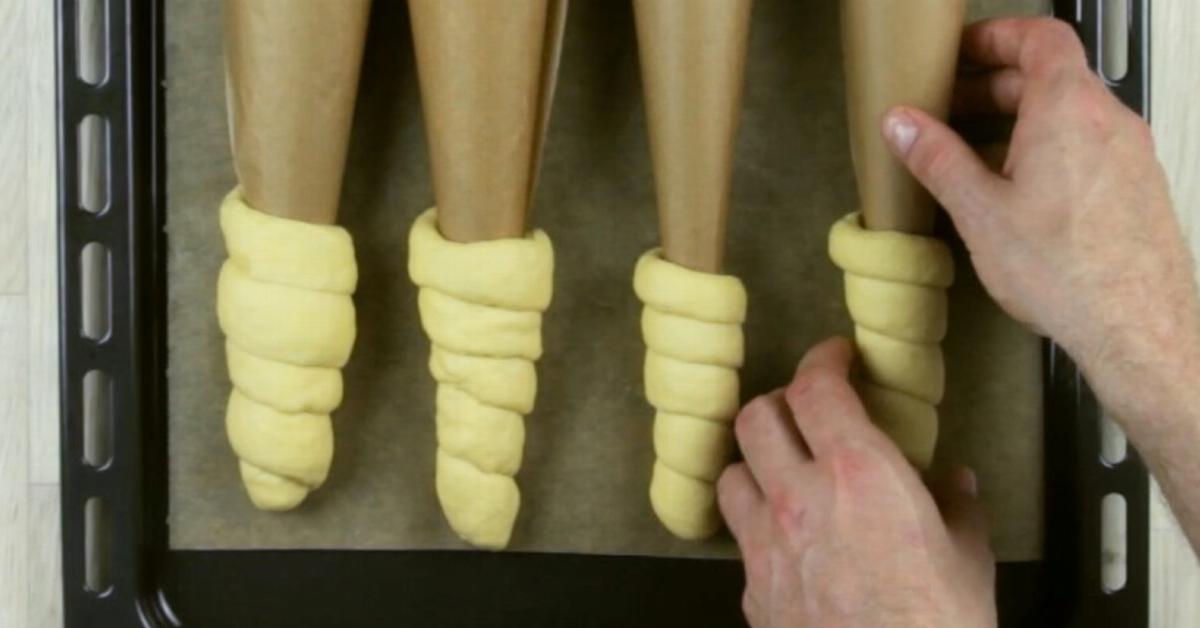 - Préchauffez votre four à 200°C. Le temps est passé et vous pouvez maintenant faire une boule que vous découpez en quatre parts égales. Chacune d’entre elle est ensuite roulée en boudin d’environ 50 cm de long. Enroulez chacun des boudins autour des cônes en papier sulfurisé. Battez l’oeuf restant et badigeonnez vos cornets avec. Saupoudrez ensuite des graines de lin et de sésame ou d’autres graines de votre choix. Enfournez pendant 20 minutes en surveillant la fin de cuisson.