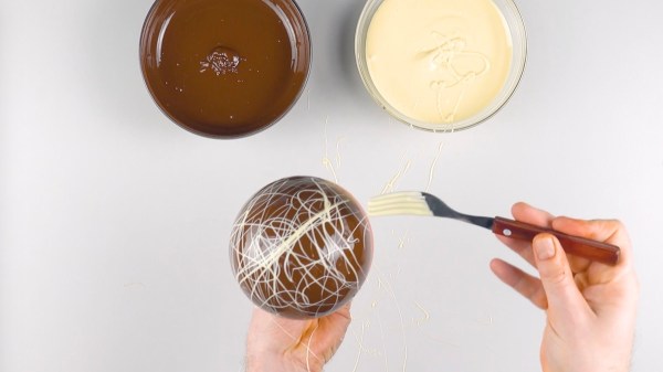 • Laissez le chocolat noir s'égoutter un peu. Ensuite, plongez une fourchette dans le chocolat blanc, retournez le ballon de manière à ce que le chocolat soit tourné vers le haut et étalez le chocolat blanc par-dessus à l'aide d'une fourchette en faisant des mouvements rapides.