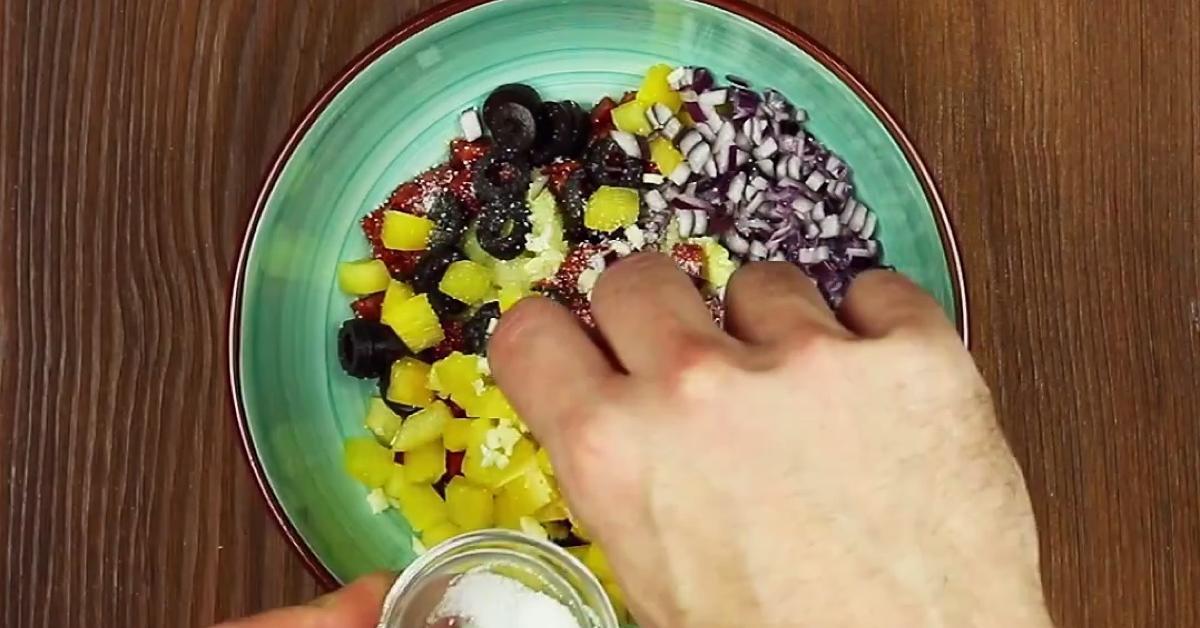 • Mettez la chair de la courgette dans un saladier et ajoutez le chorizo, les olives noires, le poivron jaune, l'oignon rouge, l'ail émincé, le sel, le poivre puis l'huile d'olive. Mélangez le tout.