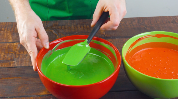 • Battez les blancs d'œufs et ajoutez le sucre petit à petit. Fouettez le tout jusqu'à obtenir une meringue ferme. Incorporez ensuite séparément la farine, le lait et l'huile et mélangez bien le tout. Divisez la pâte en deux et colorez l'une avec du colorant alimentaire rouge et l'autre avec du colorant alimentaire vert.