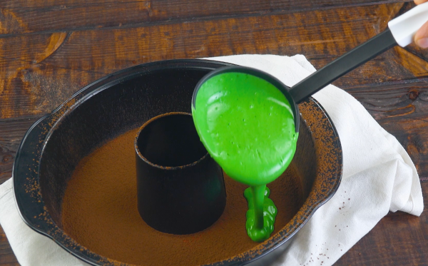 • Versez les pâtes en alternance dans le moule à savarin et tamisez toujours une fine couche de cacao en poudre sur chaque couche de pâte. Conseil : utilisez impérativement une louche pour verser la pâte et empilez les couches très soigneusement, sinon les pâtes se mélangeront. Mettez le moule à gâteau au four pendant 1 heure à 170 °C. Après la cuisson, laissez le gâteau refroidir complètement à température ambiante. Cela prend environ 2 à 3 heures.