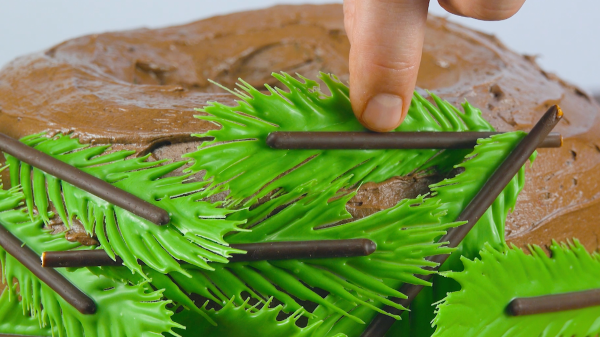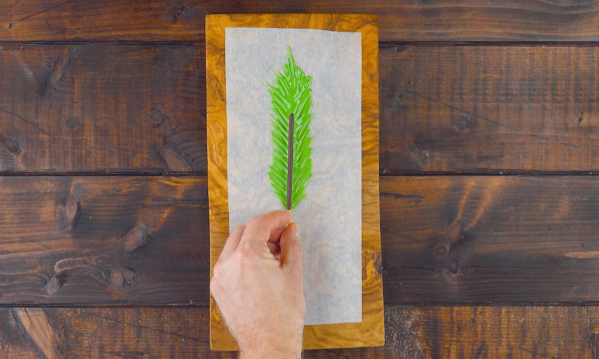 • Colorez le chocolat blanc fondu en vert. Répartissez le chocolat sur une feuille de papier sulfurisé et étalez-le à l'aide de deux fourchettes en partant du centre vers la gauche et vers la droite. Placez également un Mikado au centre. Laissez le chocolat prendre, puis durcir au réfrigérateur. Pour finir, détachez délicatement la branche du papier sulfurisé.
