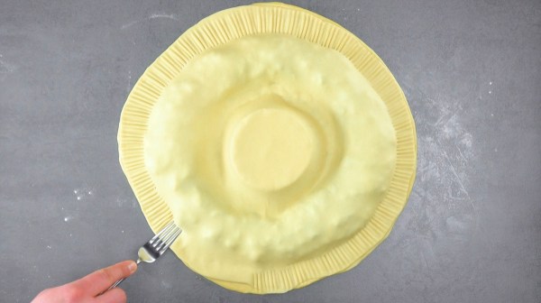 - Fouettez l'œuf et enduisez la pâte encore visible avec. Couvrez le tout avec la deuxième moitié de la pâte qui vient d'être étalée ; scellez les bords avec une fourchette.