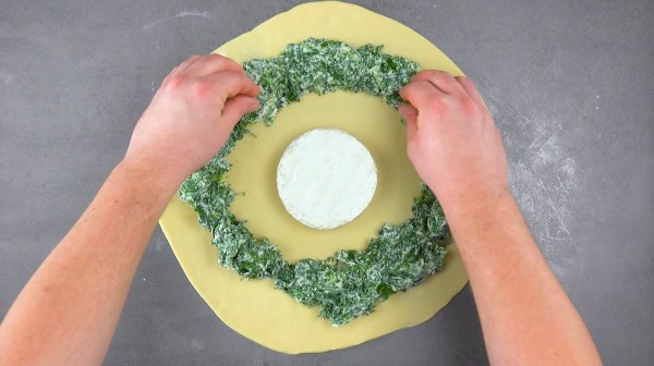 - Divisez la pâte en deux moitiés que vous étalez en ronds de même taille. Placez le camembert au milieu d'une moitié de pâte et déposez le mélange épinards-ricotta en cercle autour de celui-ci, en veillant à laisser un espace d'environ 2 à 3 cm du bord.
