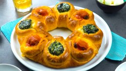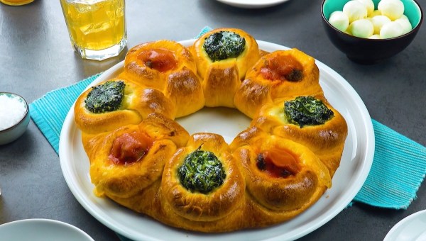 Huit donuts fourrés sur un anneau de pâte croustillante. Auriez-vous pensé qu’il était si facile de faire des donuts salés vous-même ? Les garnitures peuvent être modifiées à volonté ; par exemple, uniquement du fromage, du jambon, des légumes, etc. C’est vous qui voyez ! Bon Ap’ !