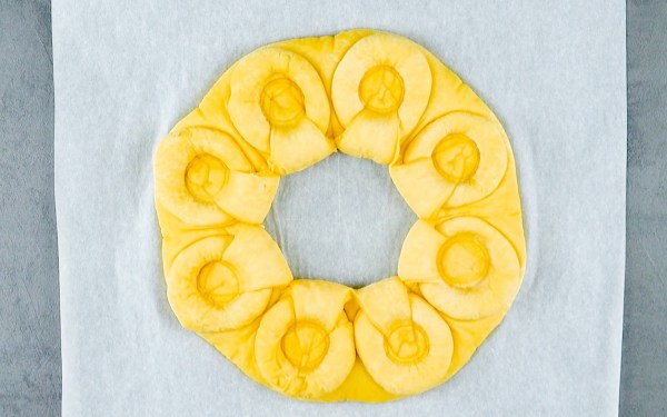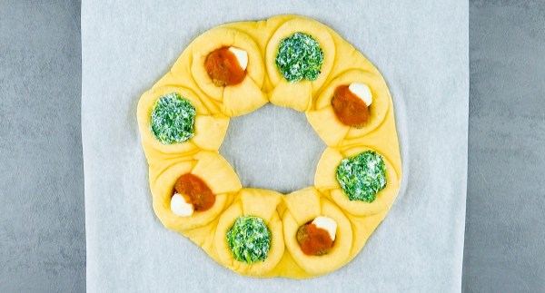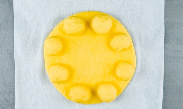 - Roulez les rectangles de pâte en boules et placez-les à intervalles réguliers autour du bord du cercle de pâte.