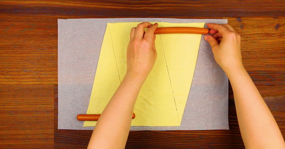 • À l'aide d'un rouleau à pizza, découpez la pâte à pizza de façon à obtenir 4 triangles. À la base de chaque triangle, mettez une saucisse et deux bâtonnets de fromage. Roulez maintenant la pâte jusqu'à obtenir une sorte de petit croissant.