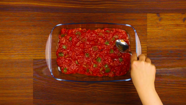 • Préchauffez le four à 180 °C (thermostat 6 - 350 °F). Faites chauffer l'huile végétale dans une poêle et faites légèrement revenir les poivrons. Ajoutez les oignons et la sauce tomate puis assaisonnez avec le romarin, l'ail, le sucre, le sel et le poivre. Laissez mijoter.