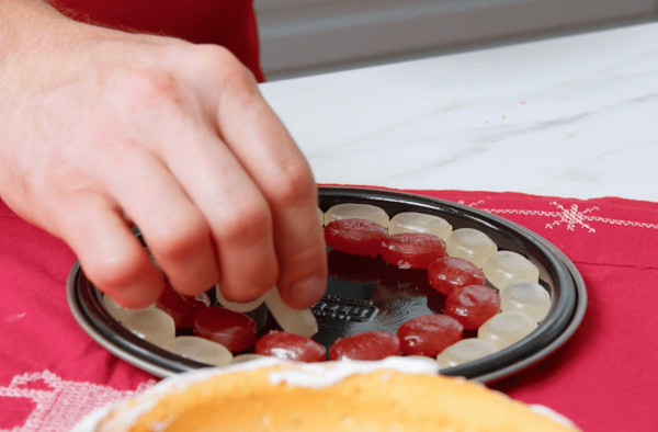 - Recouvrez le fond du moule avec les bonbons et faites-les fondre au four à 120 °C (chaleur de voûte et de sole) pendant 20 minutes. Laissez ensuite durcir la plaque de bonbons à température ambiante pendant 30 minutes.Conseil : mettez du papier sulfurisé sur le fond du moule démontable, afin que la plaque puisse être plus facilement détachée du fond par la suite.