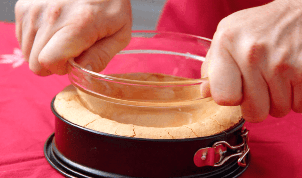 - Faites chauffer la génoise de 14 cm de diamètre pendant 20 minutes à 100 °C, chaleur de voûte et de sole. Enfoncez ensuite le saladier de 12 cm de diamètre dans la génoise de manière à former une cavité. Retirez le saladier et l'anneau du moule et enduisez l'extérieur de la génoise de crème au fromage frais. Enrobez complètement les deux autres génoises (18 et 10 cm de diamètre) avec la crème au fromage frais. Placez ensuite les trois génoises au réfrigérateur pendant 30 minutes.