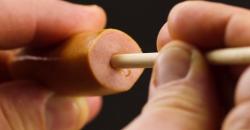 - Enfoncez un bâtonnet en bois dans une saucisse de Strasbourg, enrobez-la dans la pâte et roulez-la sur quelques frites pour que celles-ci la recouvrent presque complètement. Les frites devraient se coller à la pâte qui entoure la saucisse.