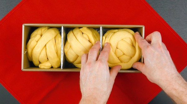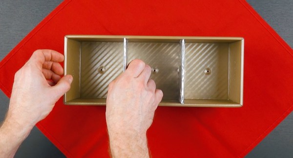 - Découpez des séparations en carton pour le moule et enveloppez-les dans du papier aluminium. Utilisez-les ensuite pour séparer le moule graissé en trois compartiments de taille égale.