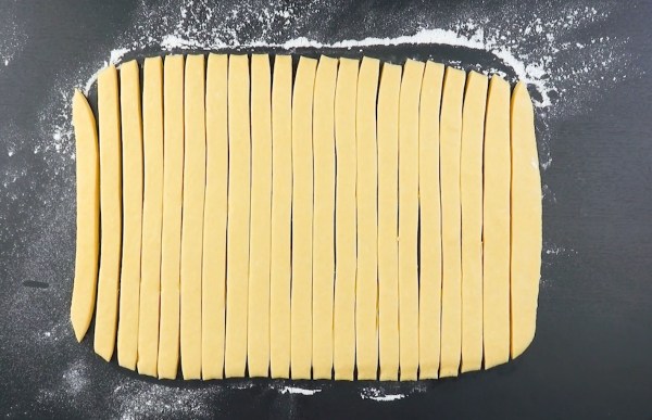- Étalez la pâte feuilletée en un rectangle et coupez-la en morceaux de la largeur d'un doigt.