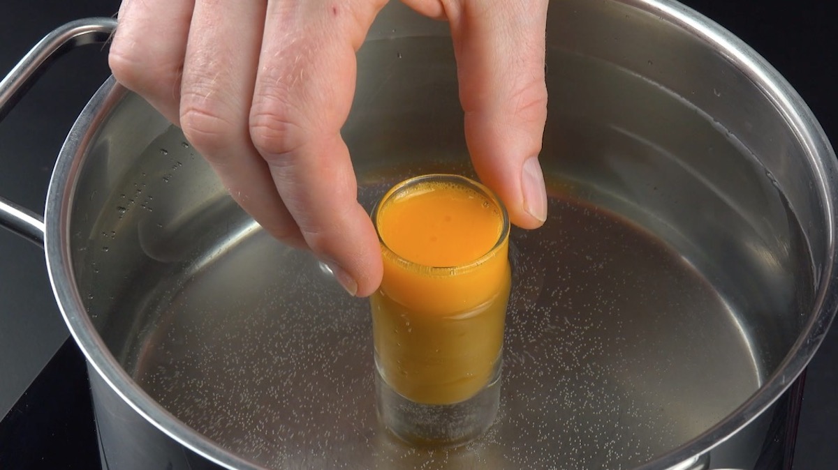 4.2) Mettez le verre à shooter avec le jaune d’œuf dans une casserole remplie d’eau et laissez cuire à 90 °C environ.