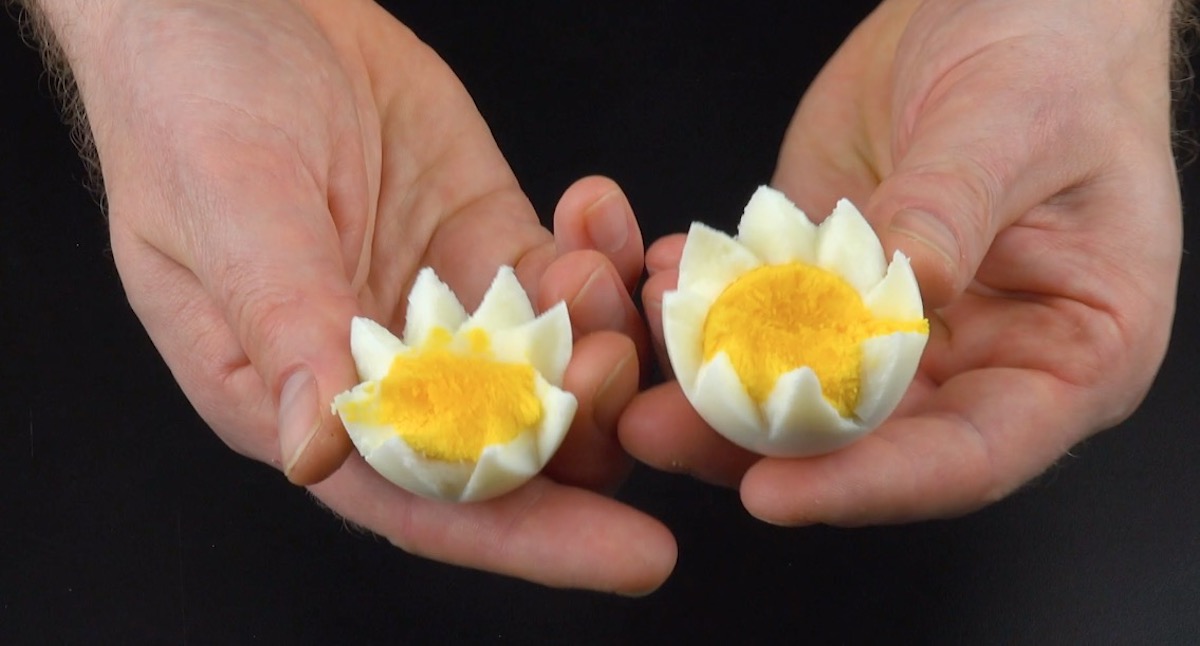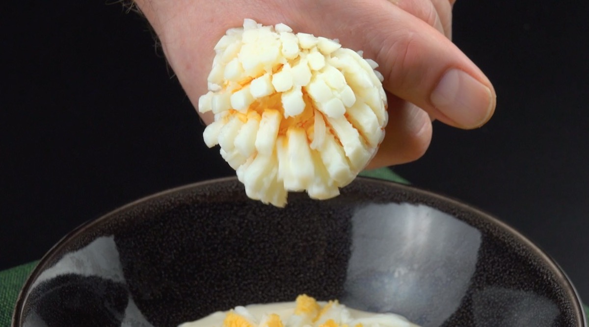 2.2) Maintenant, enfoncez le cure-dent au milieu d’un œuf dur. Utilisez ensuite le fil dentaire pour couper un motif en zigzag tout autour de l’œuf. Ouvrez l’œuf et mettez-le ainsi dans votre salade, c’est joli !