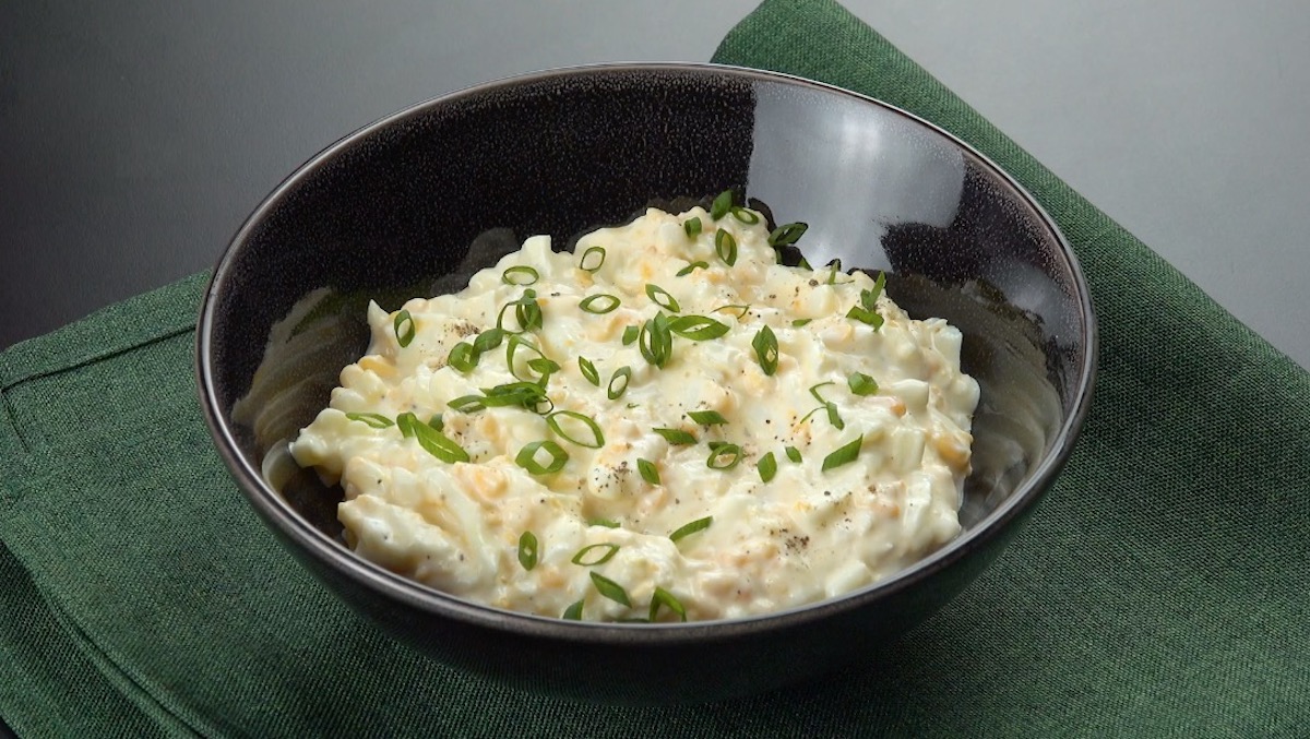 3.1) Mettez la mayonnaise, la moutarde, le sel et le poivre dans un saladier. Pressez ensuite les œufs durs dans le filet d’oignons.