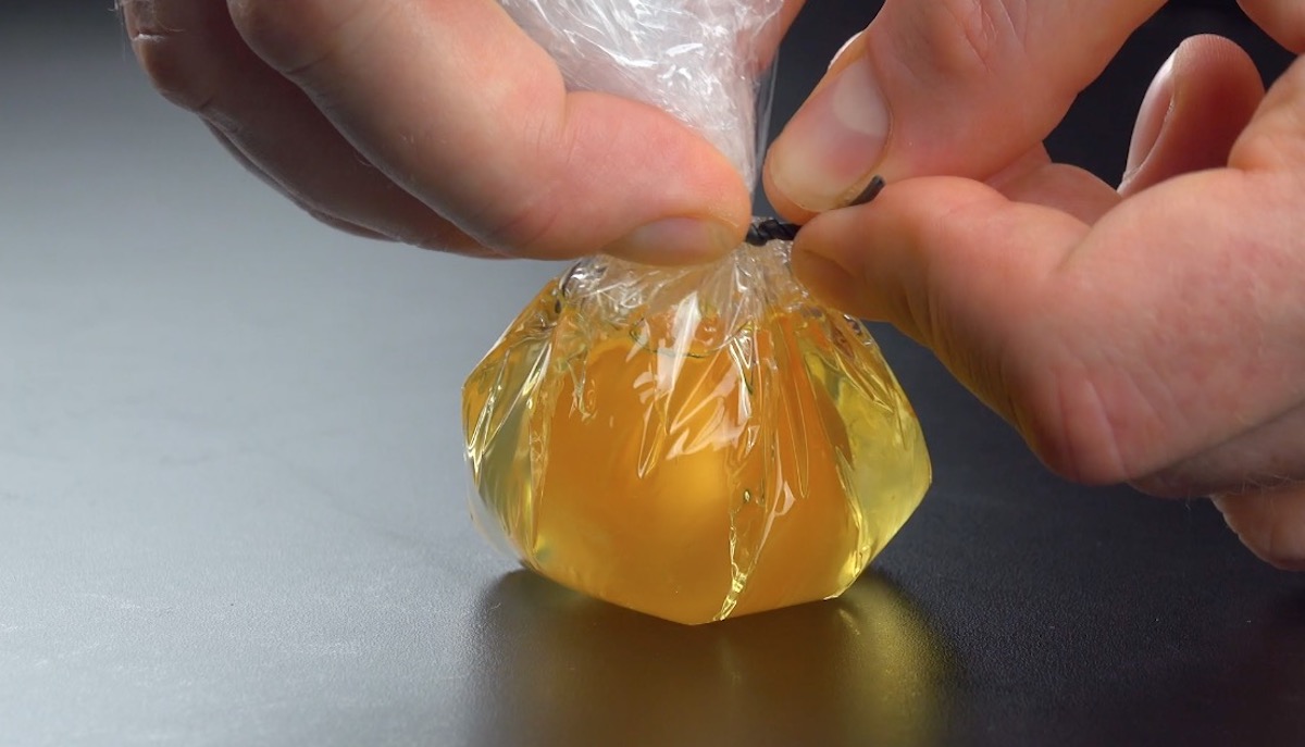 1.1) Placez le film alimentaire dans un petit bol et ajoutez quelques gouttes d’huile. Cassez un œuf et nouez le film alimentaire avec une ficelle ou un fil de cuisine.