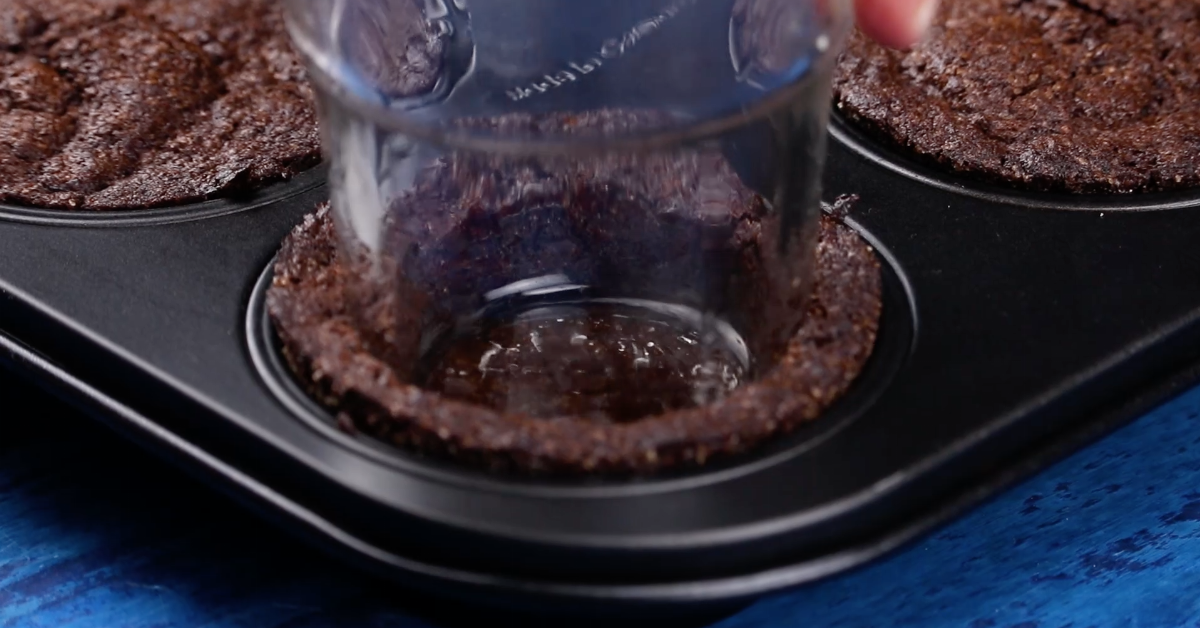 - Une fois vos mini-gâteaux au chocolat cuits, laissez-les un peu refroidir avant de les démouler. Badigeonnez d’huile les côtés et le fond d’un verre légèrement plus petit que vos gâteaux et pressez-le au centre de chacun d’entre eux pour avoir un trou.
